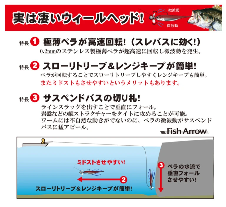 Angenommen als “Feco” zertifiziertes Produkt, gesponsert von JB und NBC (Japan Bass Producers Association)! Revolutionärer Jigkopf, der sowohl beim Fallen als auch beim Schwimmen automatisch Fische anlockt! Dieser Jigkopf mit Propeller (PAT.P) kann in allen Tiefen und sogar in Deckung verwendet werden.Passend für Jigs zwischen ca. 7 cm und 11 cm!